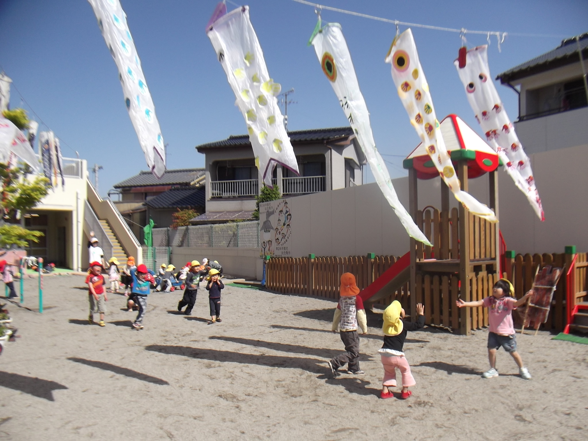 園庭では、手作りのこいのぼりが青空高く泳ぎ